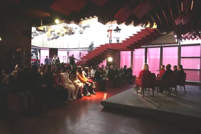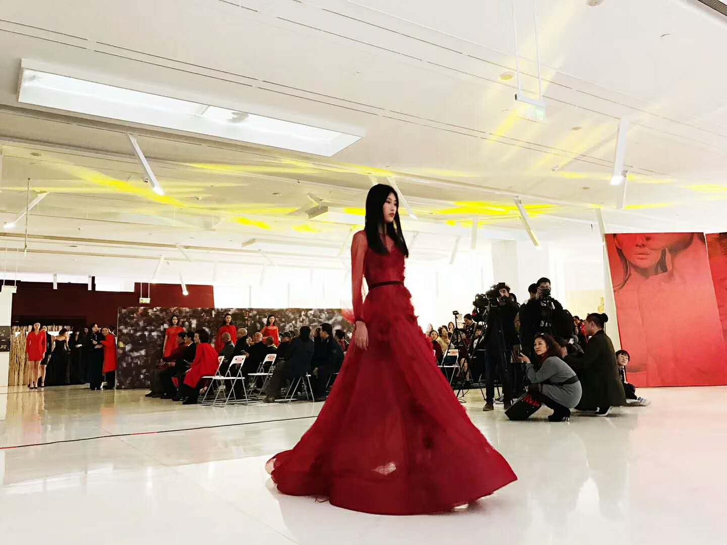 举杯庆祝之后,是女设计师马樱的时装秀。美女们轻盈的身姿仿佛是隐形人一样,她们走进展览场地,在展览大厅宽敞的空间里优雅地展示高定时装,脸上的表情是模特所特有的。