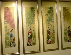 何韵兰(左)是一位艺术编辑和美术教授,国家美术展览鉴定师,目前是中国美术家协会主任。本次展览的策展人黄茜站在中间,她的右边是颇有建树的艺术家潘缨,她是北京女艺术家联谊会会长,以工笔画闻名。