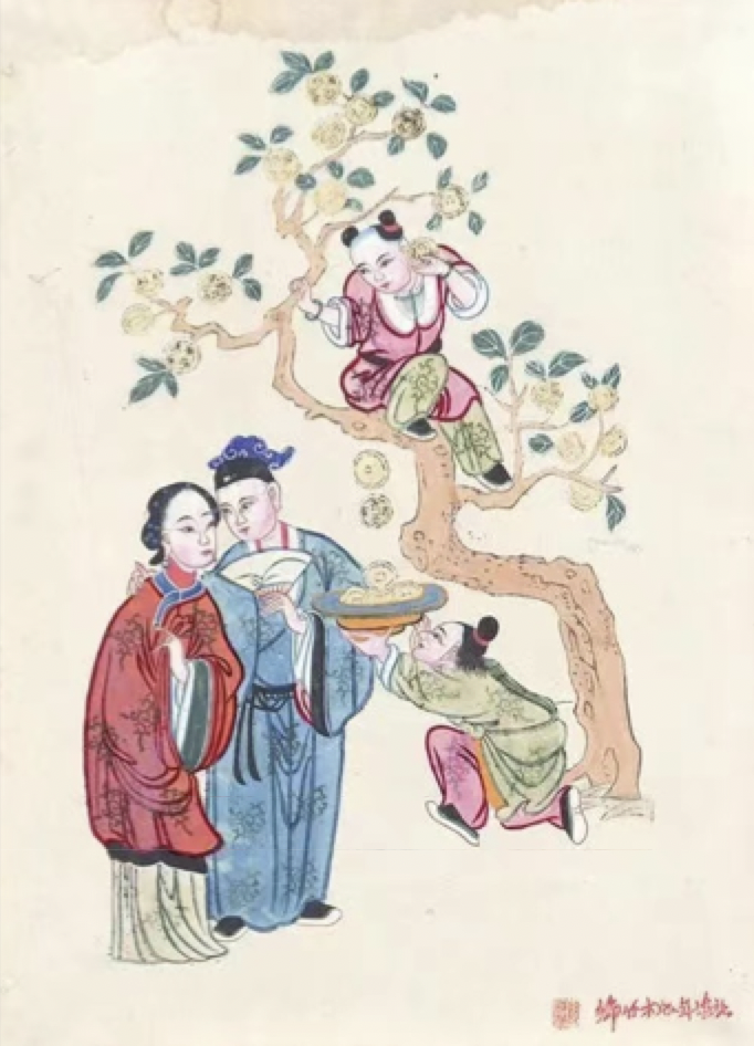 后来到了明代和清代,“摇钱树”的图案常常出现在年画和剪纸中。