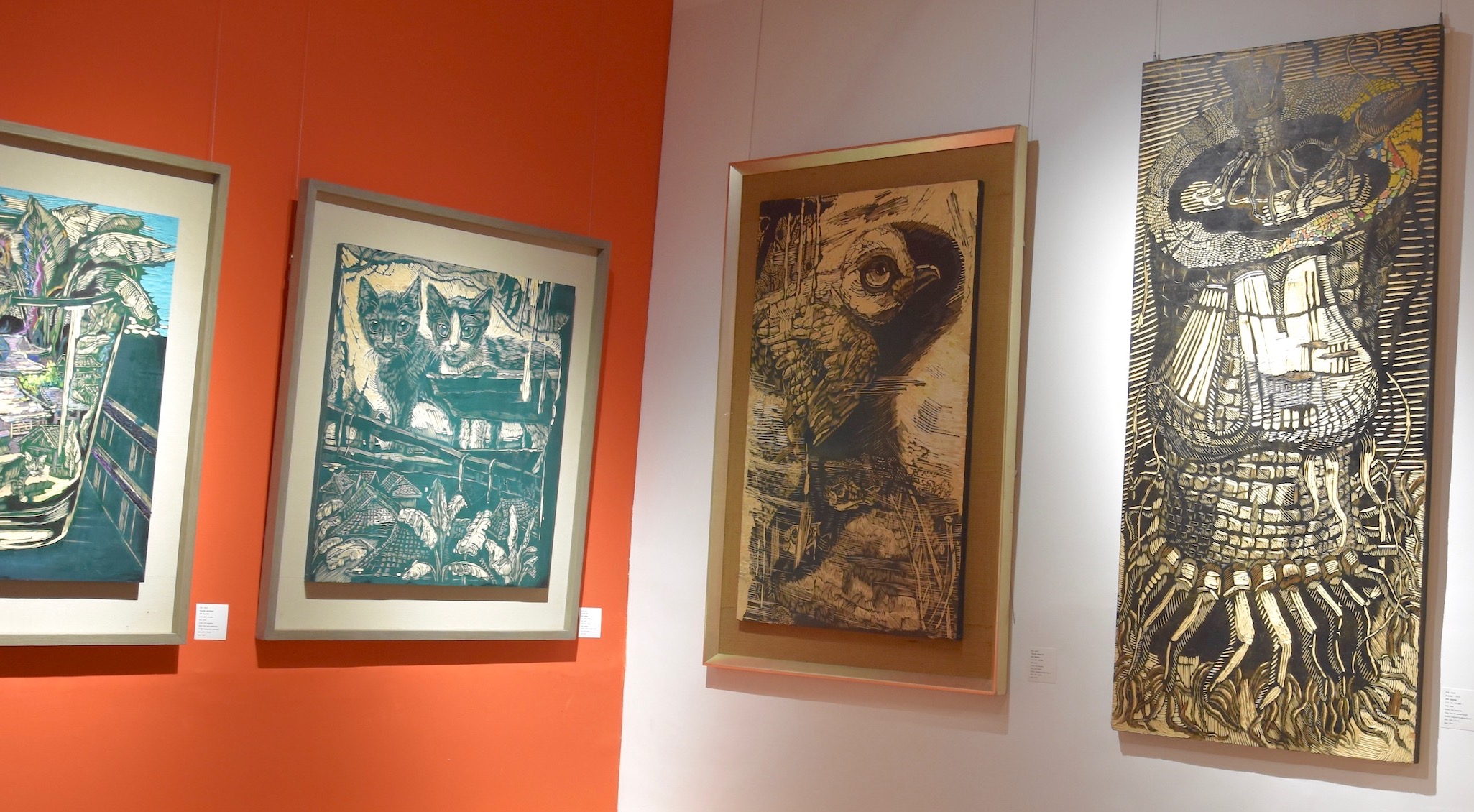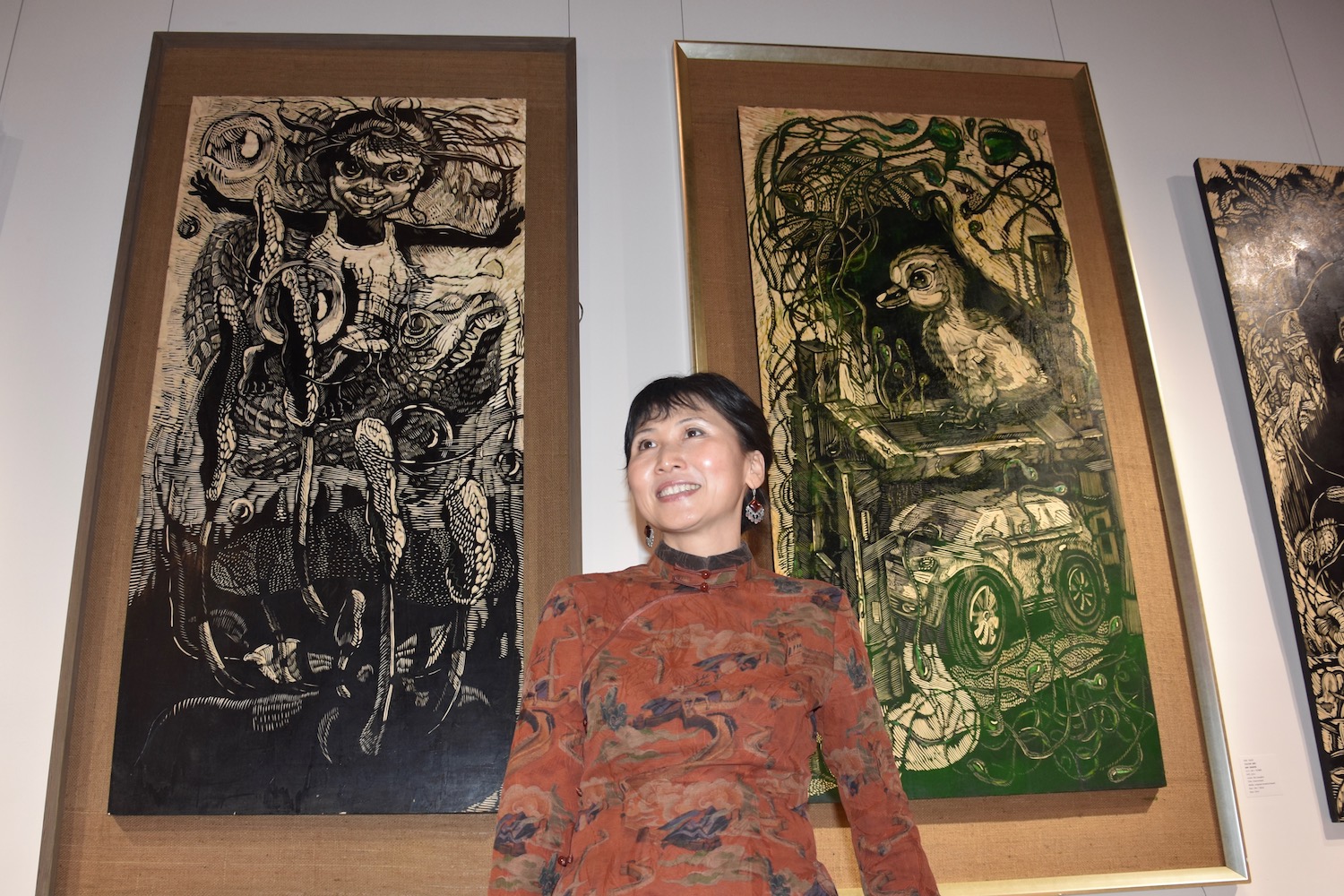 马良芬大量的木刻板涵盖了中国各地自然之旅。很多纸上印刷,包括一些反色印刷,只使用了一块板。我问她是否特别喜欢猫,她说家里没有养但是很喜欢观察野猫闲暇时探索的独立性。她的其他作品探索了一些奇思和幻想,在现实世界的领域里创造新世界。