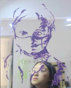 在寻找用材料发言方式的同时,质疑性别、美丽和阶级的概念。通过这种方式,材料和主题为对话创造了一个空间。在作品《涂漆》中,用美甲师(她们通常是从农村来到大城市工作的人)的指甲油在镜子上画肖像,镜面建构观者参与,颠覆主体和观者对立。