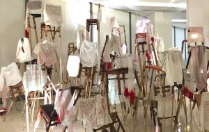 《黑暗中的女人》是反对性别歧视和性别暴力的国际的艺术项目,描述了社会指定给女性的地位。在该项目中,女性通过用红色马克笔在白色衬衫或类似的女性衣服上书写心声以公开她们的经历、痛苦、希望和愿望。除此之外,缺失话语、未知故事、无法述说以及保持缄默也是艺术作品的中心主题。长沙的这件作品包括由来自6个不同国家的女性书写的52件衬衫和一本记录所有文本的书(译成中文)。只有各个国家和文化组织间相互合作才有实现这一目标的唯一可能。作品《不平衡》中,椅子成为逃脱其任务的物体,生长,展示其背面。衬衫上书写的来自女性的勇敢和有力的声明,突出了脆弱性的不平衡。