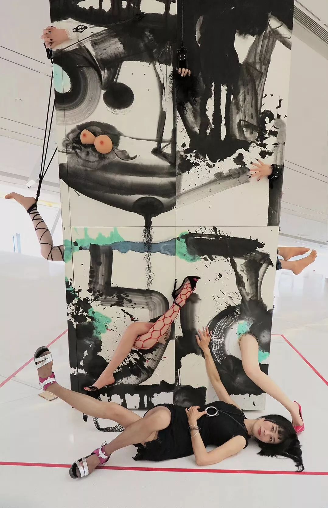 我的黑色丙烯线喷薄而出,它在空中画出神经质的线,我创造出新的物种,它是人兽的混合,它有动物性,却带有人类的敏感。在这个陌生而又熟悉的世界里,我要见证女性生命短暂而脆弱的状态。