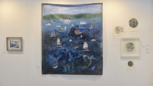 Fion Gunn参展的是篇幅巨大的海运题材作品《驶过》,这是系列作品的一部分,源于她痴迷于把个人和集体叙事联系在一起。她产生了这样一个想法,我们所有的人都在生命中航行,我们的历史仅仅是沿着广阔的时间线飞速驶过。巨大的作品吸引了观众,人们可以看到海洋生物所在的水下世界,穿着阿伦针织衫的水下人物正跟着一队帆船穿越到水的表面。