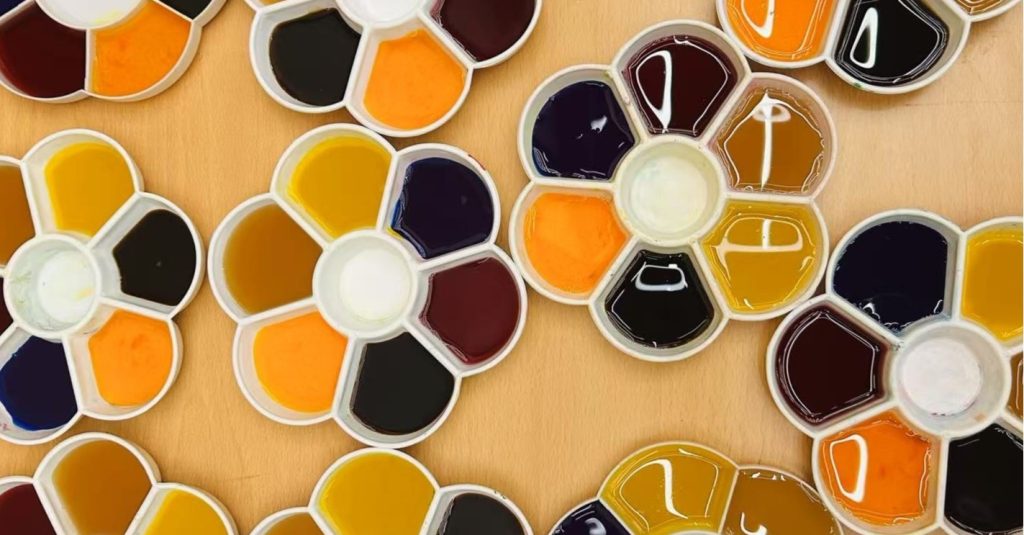 调色板上的颜料有:藏红花(亮橙色,不过在纸上是明黄色)、石榴(在调色盘上呈茶色,在纸上则是美丽的黄绿色)、姜黄素(深黄色)、蓝螺旋藻、甜菜根红、咖啡色。