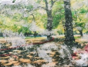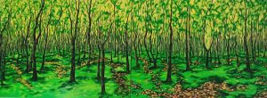 我在爱尔兰卡洛长大,我家花园里有两棵紫叶山毛榉。妈妈一直照料着这个大花园,直到今天仍然如此。一棵榉树长在房子附近,另一棵和其他树一起长在花园后边,上面的作品画的就是这里。斑驳的阳光透过叶子洒在地面上,我和我的七个兄弟姐妹在那里玩耍、打架、修自行车、独木舟和小船。我度过了一个无忧无虑的童年。许多年后,靠近房子那棵山毛榉死了。几年以来,一家有线电视公司好几次都把电线固定在树上。我们不是这家公司的客户,没用过他们的服务也没付过任何费用,但他们就是要电线穿过花园到达另一户人家,这样比从马路上布线便宜。过了几年,树皮渐渐把电线包起来,有线电视公司就派人钉上新电线,就这样,这棵树先后吞下三根电线,最后它死了。树有20米高,在暴风雨来的时候有可能倒下来砸到房子上。但有线电视公司仍然拒绝拆除他们的电线。