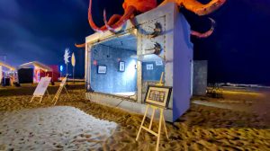 Mini solo exhibition inside a TV , under an octopus, next to a beach ...part of Rizhao Binhai International Land Art Festival August 2025