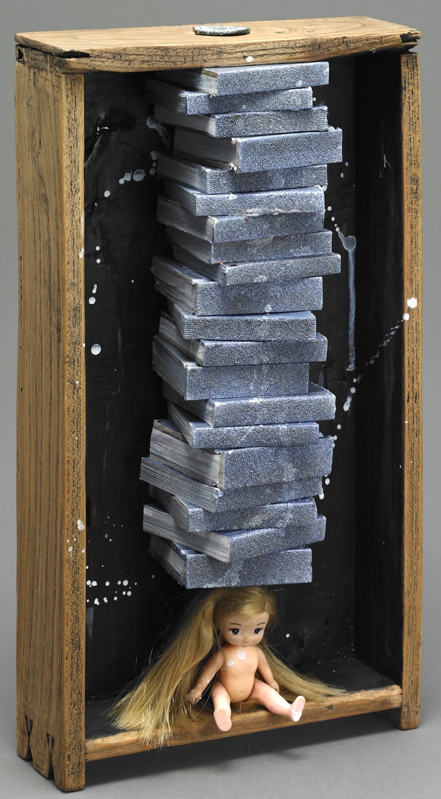 “As children we are taught to be afraid, we are told don’t do this or that. We place incredible pressure on our youth.” One of the drawers features a doll balancing twenty books on her head.