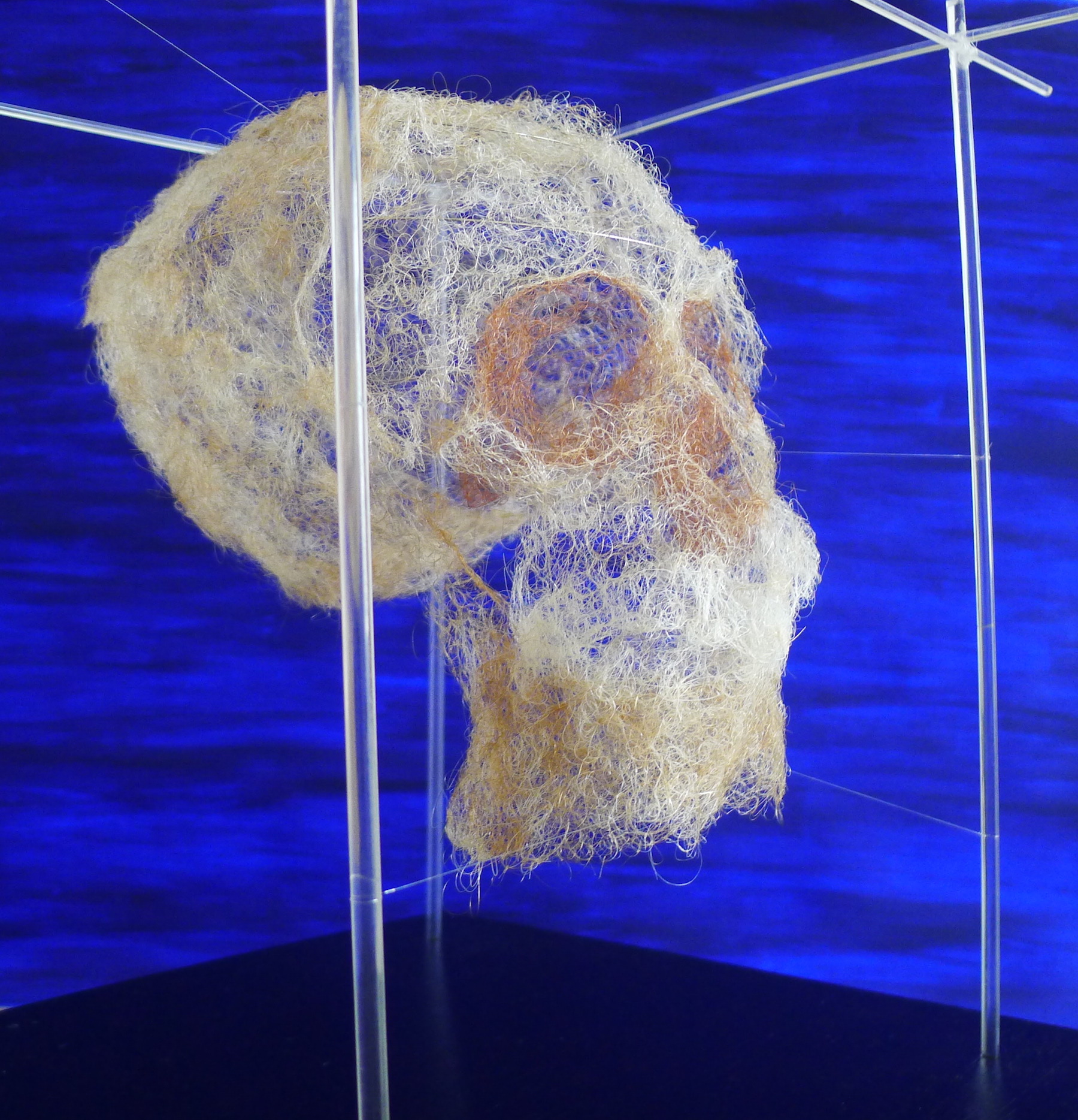 Physically knitting your own genomic material is a very contemplative process. Each strand is tested for strength, elasticity and tensility before being selected for specific sections of the sculpture. The white hairs are strong and tensile and suspend the skull with ease. The coloured hair is soft but elastic and resilient.