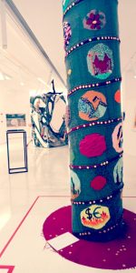 The knitted ‘Pillar of Time’ explores time from a female perspective. It was made especially for an exhibition titled Intimate Revolution – A discourse on disappointment (Irish Wave 2012). The ‘Pillar of Time ‘ has two calendars private and public which are aligned side by side. The private cycle of a woman (450 gold discs for the cycles in a lifetime) and the public world events spanning from the Cuban missile crisis in 1962 to the global economic crisis in 2008. And so the memory of births, deaths, miscarriages and terminations are positioned with external world events.