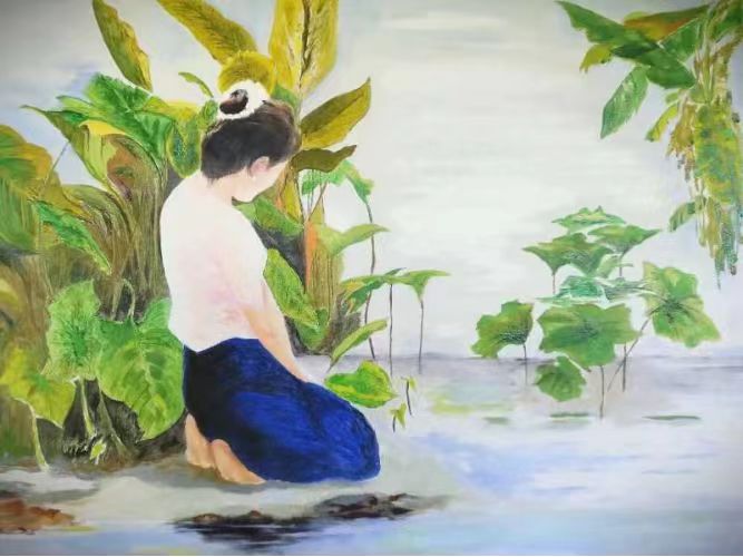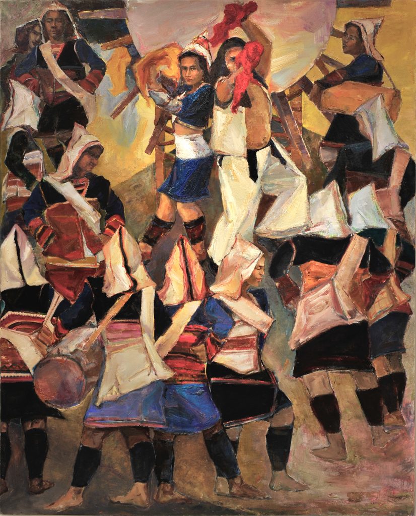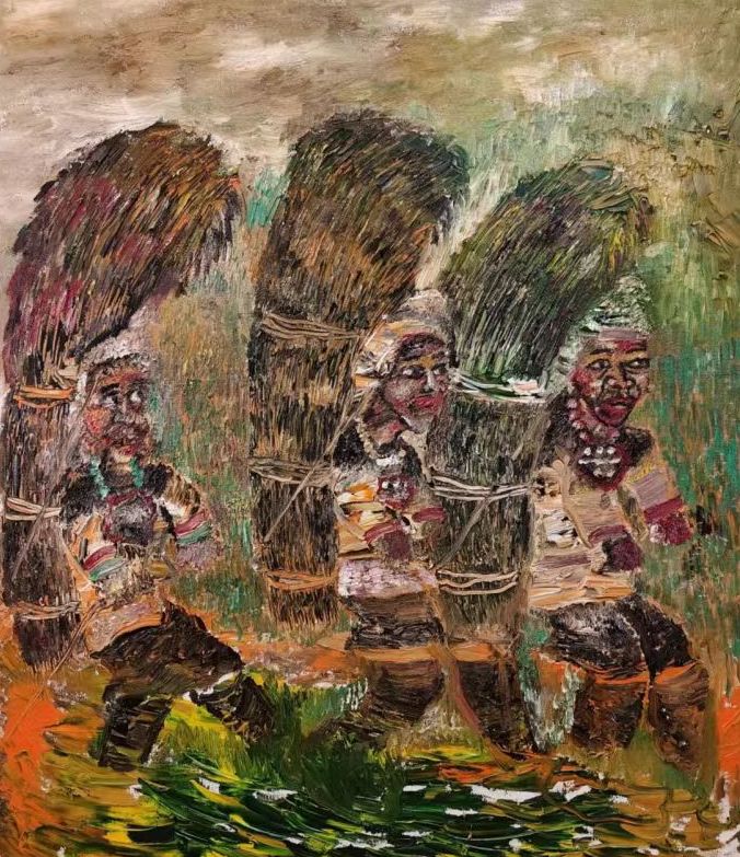 The Jinuo people have lived in frame-structured wooden houses in the mountains for generations. The houses are built with thatch cut from the wild and made of straw. This work I created is based on the memory of my childhood 40 years ago! In the painting, several young men from the same village go to collect grass and come back together. After getting married, the Jinuo woman can no longer feel at ease and rest for a day. She is the breadwinner of the family.