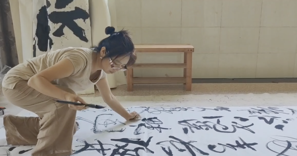 Cai Meng Xia is a professor of Calligraphy with CAFA Central Academy of Fine Arts in Beijing. Her work is renowned for its power and strength and people are often surprised to find the author of such works created from such a small physique. I was thrilled to be working next to her on the third floor of the Octagon.
