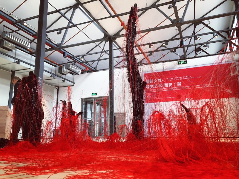 The impressive venue Dahua 1935 in Xi’an used to be an old textile mill and the current show reiterates many textile references by the dispersal of the suspended banners .