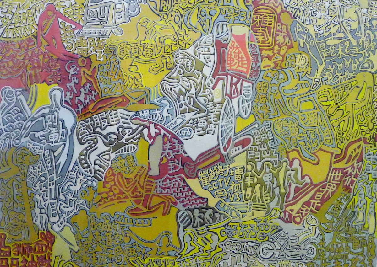 Once you enter the huge space of Yi Lings two long walls are filled with five layers deep of huge canvasses laid side by side, each canvas co joined by the imagery on the edges in the dialect that is specifically Yi Ling’s. The imagery in the bold outlines of folk art, a wild dance of geometric designs and calligraphy until his canvas is an intricate maze of line and colour in which the figures are barely distinguised. It is the quest for balance of polar opposites “The Chinese reality is Toyotas as well as horse-carts, skyscrapers as well as shanties, people who believe in capitalism and people who believe in Communism. It is crowds, complexity, chaos,” These icons of modernity and the ancient are interlaced with Chinese characters.