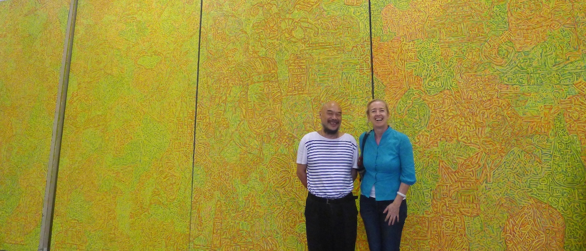 Once you enter the huge space of Yi Lings two long walls are filled with five layers deep of huge canvasses laid side by side, each canvas co joined by the imagery on the edges in the dialect that is specifically Yi Ling’s. The imagery in the bold outlines of folk art, layers of geometric designs and calligraphy until his canvas is an intricate maze of line and colour in which the figures are barely distinguised. It is the quest for balance of polar opposites “The Chinese reality is Toyotas as well as horse-carts, skyscrapers as well as shanties, people who believe in capitalism and people who believe in Communism. It is crowds, complexity, chaos,” Yi Ling says. These icons of modernity and the ancient are interlaced with Chinese characters.
