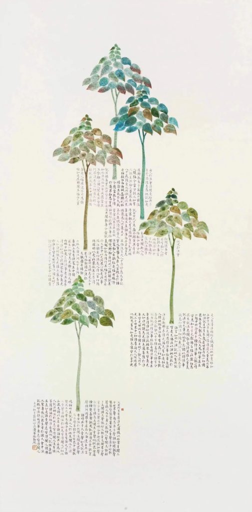 Over the years we have met each other at DongYue Art Museum and I have long admired Zheng’s work. Her meticulous writings on heart Sutras, the Dao de Jing and other Buddhist texts merged with unexpected images of Trees connected with me in real and profound ways.