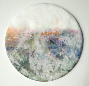 Niamh Cunningham, Ha’penny Bridge sucrose, mixed media 2018 30×40 cm oval